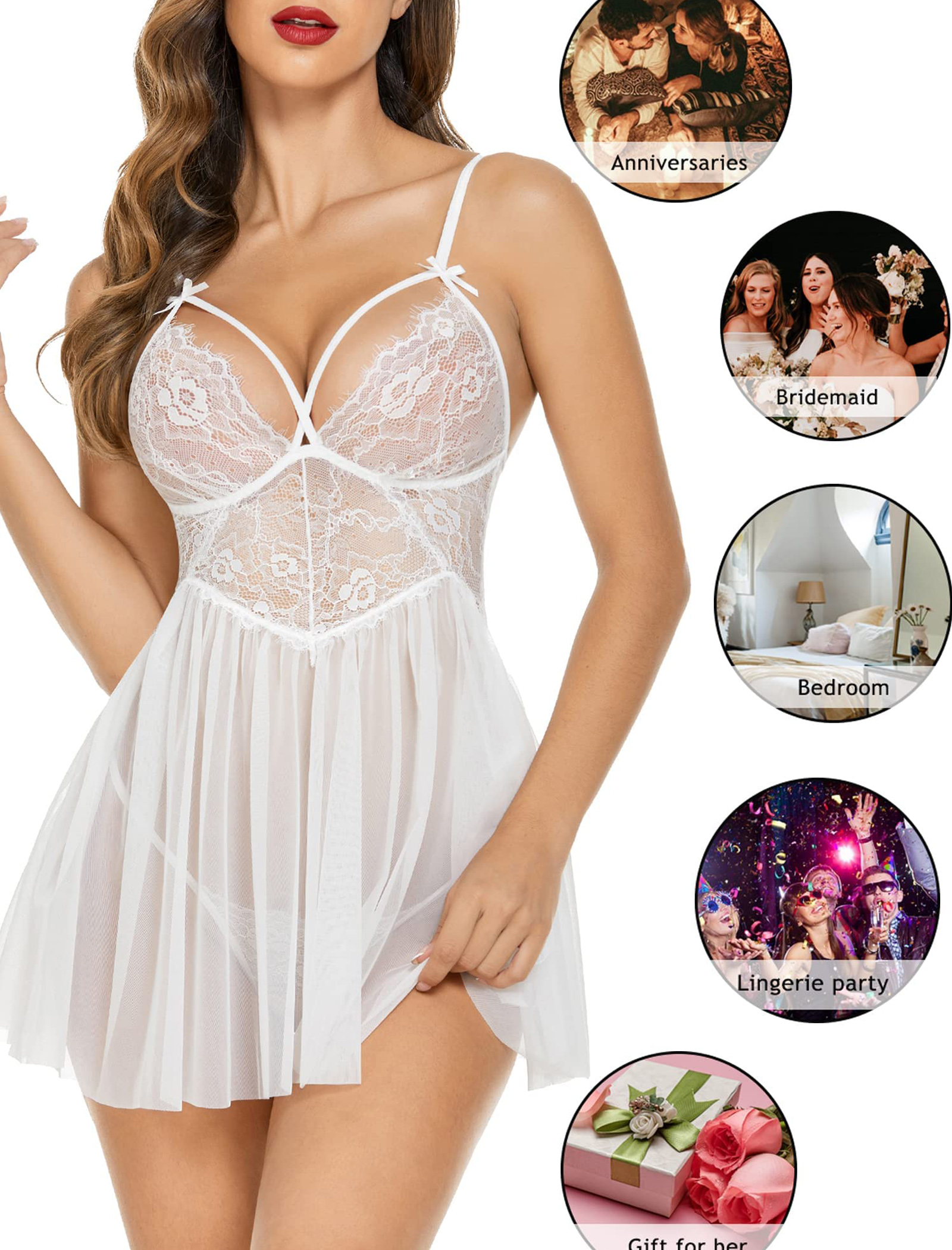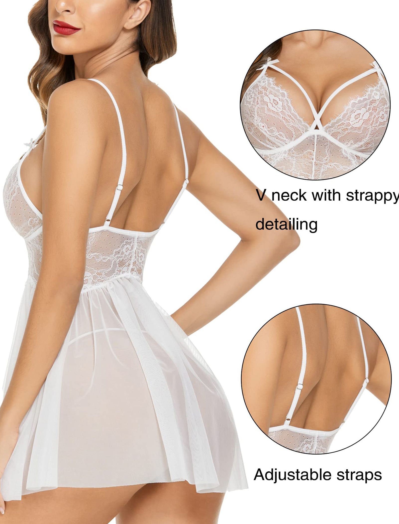 Features: Adjustable straps, lace cups, sheer mesh skirt, matching thong